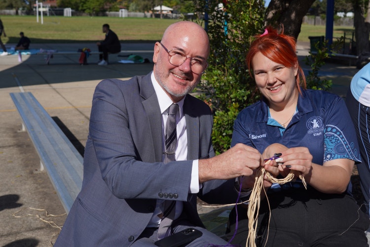 AEO Kenesha Bell teaching Director Dace Elletson to weave during reconiliation walk activites.